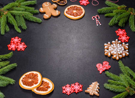 Christmas decorations and gingerbreads on a dark concrete table. Preparing and decorating the house for holidays