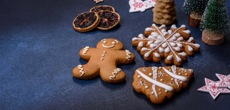 Baked Christmas cookies on rustic dark background.