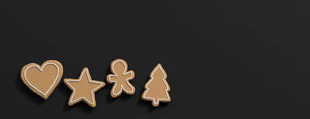 Christmas preparation, gingerbread cookies. Top view of christmas gingerbread cookies, isolated, against black background, copy space, banner. 3d illustration