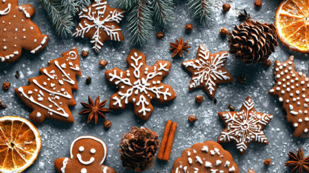 A delightful flat lay of homemade gingerbread cookies, pine cones, cinnamon sticks, and dried orange slices, evoking a warm holiday spirit.