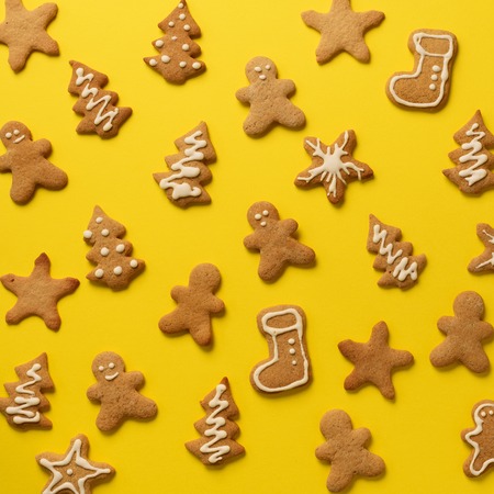 Homemade christmas cookies on yellow background.