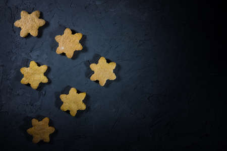 Christmas gingerbread cookies in the form of snowflakes on a dark background