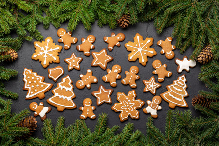 Christmas fir tree branch and various gingerbread cookies. Flat lay