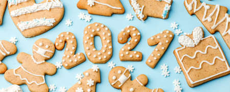 Winter Holiday pattern - set of gingerbread on light blue background - man in mask, house, xmas tree, stars and Number Happy New Year 2021, Merry Christmas background, trendy concept