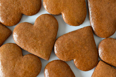 Gingerbread hearts stacked side by side, view from the top, can be used as a greeting card for Valentine's Day.