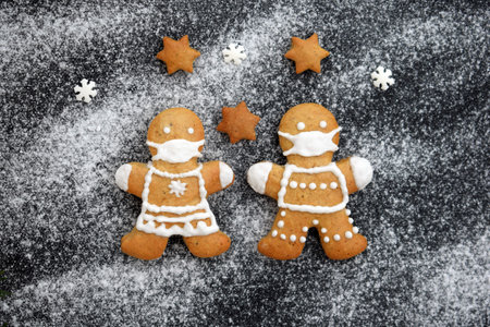 Cute gingerbread couple with protective face masks on black sugared background with stars and small sugar snowflakes. Christmas or New year concept, coronavirus winter. Greeting card