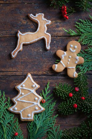 Christmas cookies on a wooden background with fir branches and christmas decorations