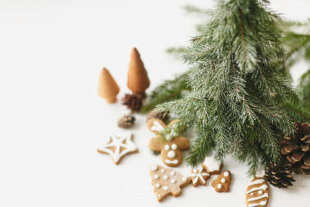 Christmas fir trees, gingerbread cookies, pine cones on white wooden background. Tasty homemade gingerbread cookies and festive decor. Season's greeting card, Happy Holidays!