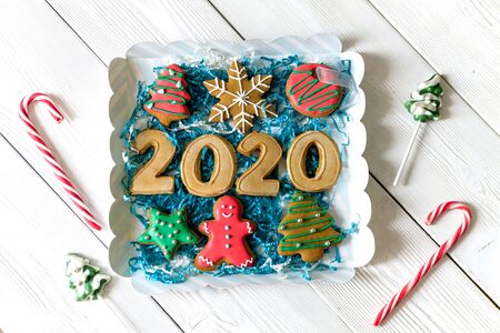 a box with gingerbread figures 2020 and other traditional Christmas sweets on a white wooden background. Candy cane, round snowflake and ginger man, star lollipop. Top view. Flat lay. Christmas concept