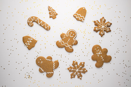 Fresh and tasty Christmas gingerbread cookies placed on white rusty table. Different shapes. Santa claus, snowflake, tree, gift, snowman.