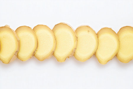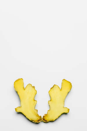 Slices of fresh ginger on white background
