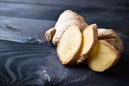fresh ginger on gray background copy space, ginger root and slices