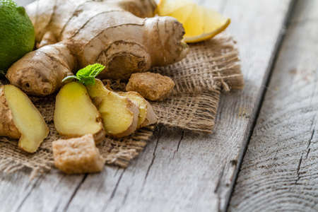 Fresh ginger root and lemons