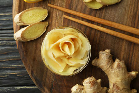Tray with pickled ginger, chopsticks and ginger on wooden table