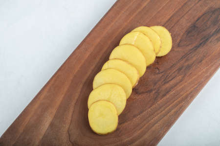 Sliced yellow potato on brown wooden board