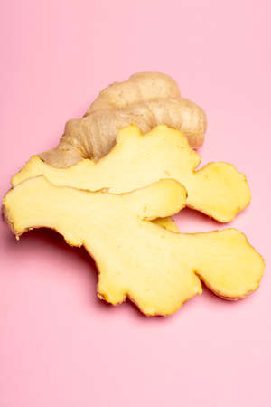 View of ginger slices. Ginger is well known food used in home remedies for flu and boosts immunity