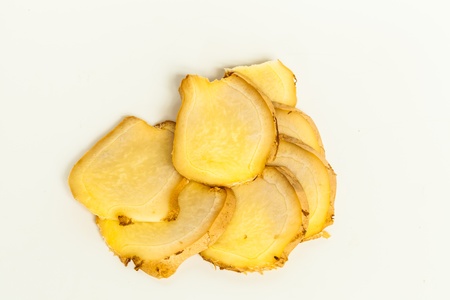 Fresh galangal slices isolated on white background.