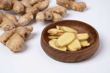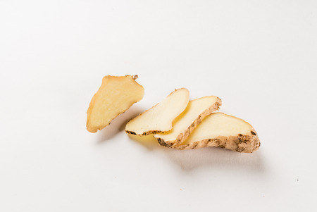 Sliced Root of Organic Ginger Natural Antibiotic, Spice and Seasoning over white Background