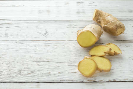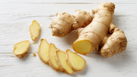 Fresh ginger root with sliced pieces on a rustic white wooden background. Natural spice, aromatic, and healthy ingredient used in cooking, tea, and herbal remedies.