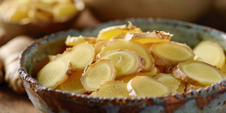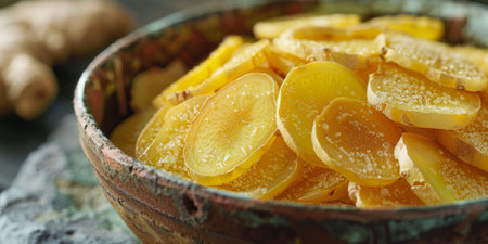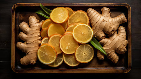 ginger slices, arranged in a harmonious pattern, occupy the center of a rustic wooden tray, showcasing their vibrant orange-yellow hue and delicate, thin shape, perfect for adding a burst of flavor and aroma to various culinary creations, from teas to stir-fries and baked goods. ai generated
