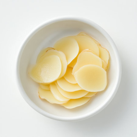This image features freshly sliced white potato rounds arranged in a simple bowl, ideal for showcasing culinary preparations, healthy recipes, and cooking ingredients.