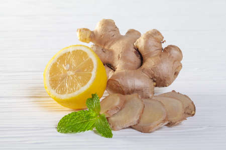 Ginger lemon mint on white wood background, copy space