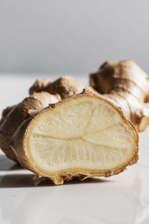 A vibrant image of a freshly cut ginger root, displayed on a bright surface. The natural light highlights its unique texture, emphasizing its culinary uses and health benefits.