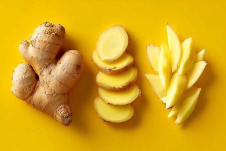 Bright yellow background showcases fresh ginger root alongside neatly sliced pieces, highlighting its natural texture and vibrant color for culinary inspiration.