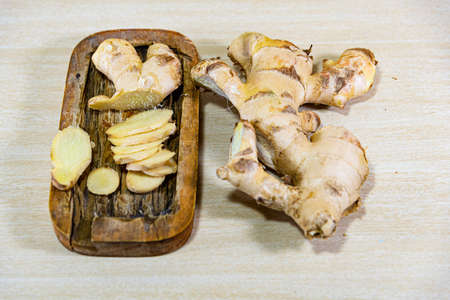 Whole root of fresh ginger and some slices on rustic wooden background