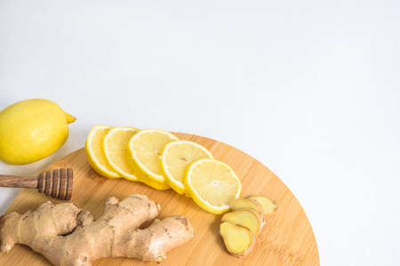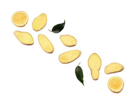 Slices of fresh ginger and lemon on white background
