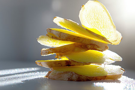 Stack of thin ginger slices, brightly lit, showcasing the natural colors and textures of the spice. The light highlights the intricate details of the slices. The presentation emphasizes the visual appeal of the food.