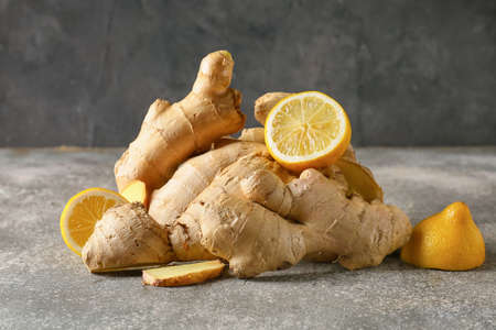 Fresh ginger and lemon on table