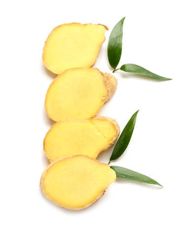 Sliced fresh ginger on white background
