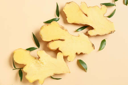 Fresh ginger root on a beige background.