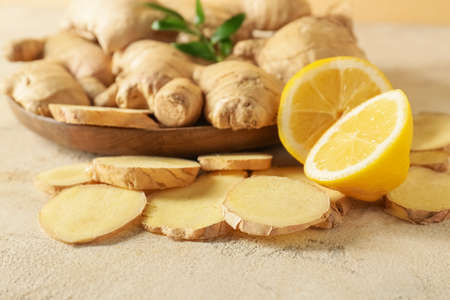 Fresh ginger slices and lemon on table