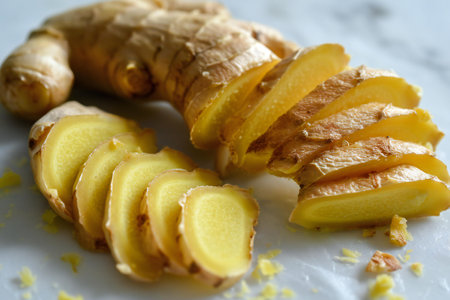 ginger slices are artfully arranged on a rustic wooden tray, showcasing their vibrant orange hue and delicate texture, perfect for adding a burst of flavor and nutrition to various recipes, from stir-fries to herbal teas, and even as a natural remedy for digestive issues. ai generated