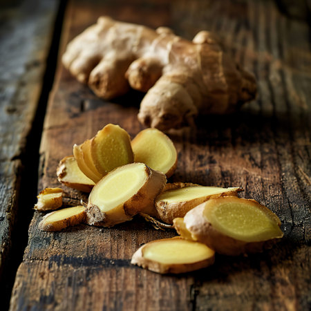 Freshly sliced ginger root rests on a wooden cutting board, surrounded by herbs and spices. This vibrant scene captures the essence of cooking and natural wellness.