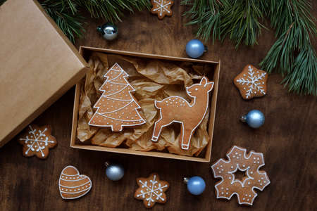 empty kraft box with brown lid for sweets, cookies on New Years table with gingerbread for home delivery from pastry shop. new year food delivery concept.