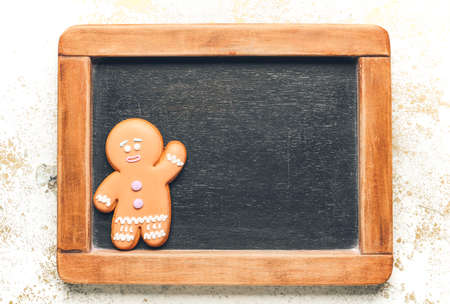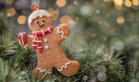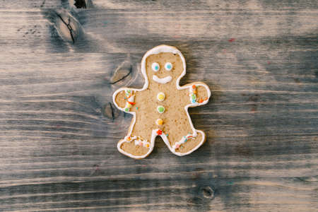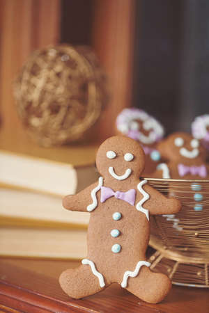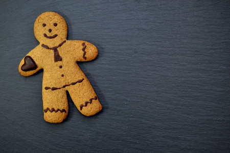 Decorative figure of a gingerbread man on a Christmas background. Decorative Christmas picture with a copy space.