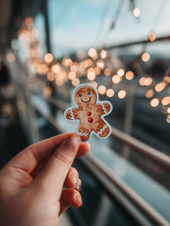 A hand is displaying a cheerful gingerbread man decoration amid twinkling lights, capturing the warm and festive atmosphere of a winter celebration.