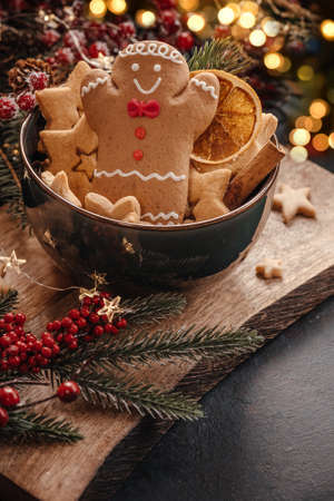 Christmas glazed gingerbread in the bowl and festive decor, place for text