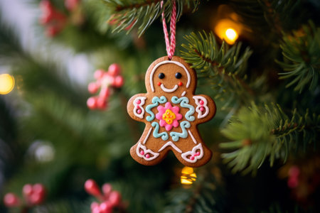 Christmas tree ornament in the shape of a gingerbread man with colorful decoration. Generative AI illustration
