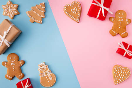 High angle above view photo of divided into two pink blue color parts background decorated sweet holiday biscuits figures giftboxes x-mas greeting postcard idea composition