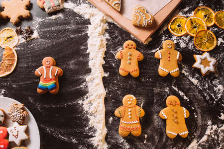 Christmas gay bakery. Creative lgbt pastry. Sexual diversity. Chocolate icing gingerbread man rainbow shorts dividing from male female figure biscuits by flour line on festive decorated desk.