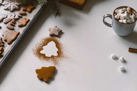 Christmas gingerbread cookies on a white marble background. Homemade delicious Christmas gingerbread