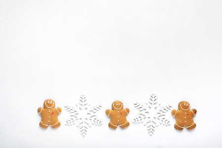 Christmas composition made of snowflakes gingerbread man cookies on white background. Winter holidays concept. Flat lay, top view, copy space
