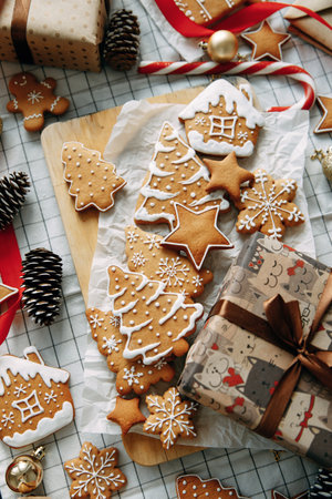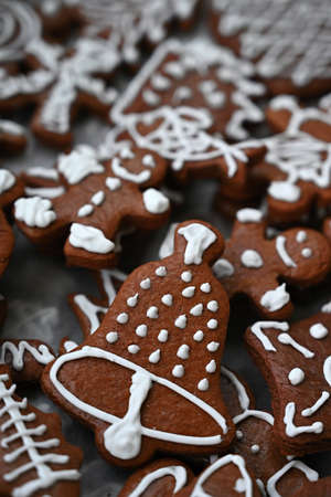 Traditional Christmas cookies. Homemade sweet decorated gingerbread biscuits with icing