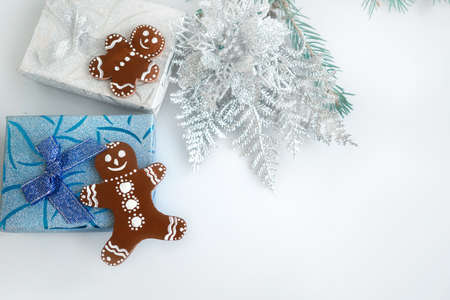 Top view of decorated Christmas gingerbread cookies with decorations on white table background with copy space, concept of holiday celebration.