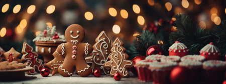 Cheerful gingerbread figures with festive decorations on a table during the holiday season