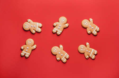Happy 2022 New Year's set of cookies, gingerbread man, woman in face from ginger biscuits glazed sugar decoration in kids hands on red background, minimal seasonal pandemic winter holiday